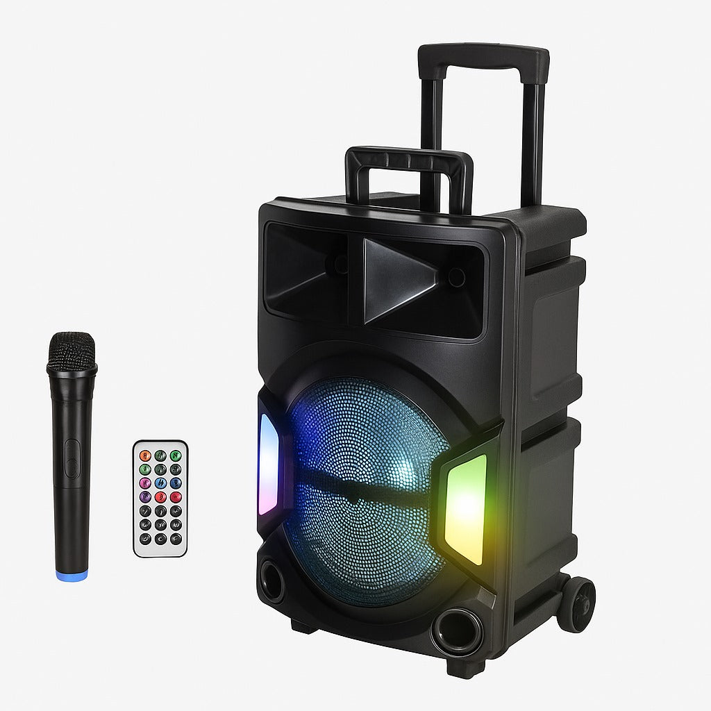 ✅ Woofer de 12” para bajos profundos y potentes ✅ Conexión Bluetooth, USB, SD y AUX ✅ Radio FM integrada ✅ Batería recargable de larga duración ✅ Diseño portátil con agarradera y ruedas para fácil transporte ✅ Incluye micrófono para karaoke 🎤